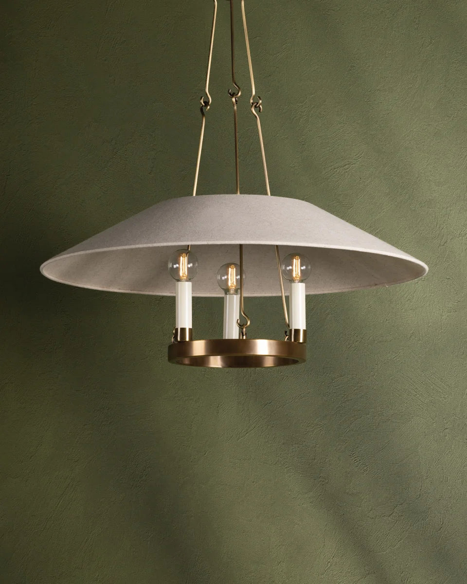 A cross between a ring chandelier and an airy lantern, Archive blends familiar forms into something distinctly fresh. Candle-style lights are arranged within a metal frame, finished in Patina Brass or Bronze, and paired with cream candle sleeves that echo the soft, natural linen shade above. Available in two sizes, Archive makes an elegant statement above a dining table or gathering space.