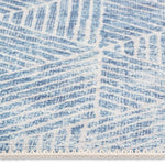 The Aura Rug is beautifully crafted of 75% Recycled Cotton and 25% Polyester. Its 0.20" pile height features a fresh cream and blue geometric pattern with a blanket stitch edge. Perfect for a high traffic area or a child's bedroom, it is machine washable.