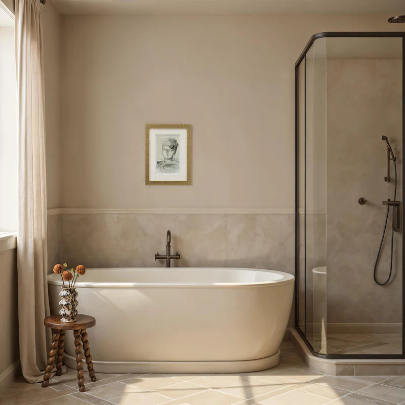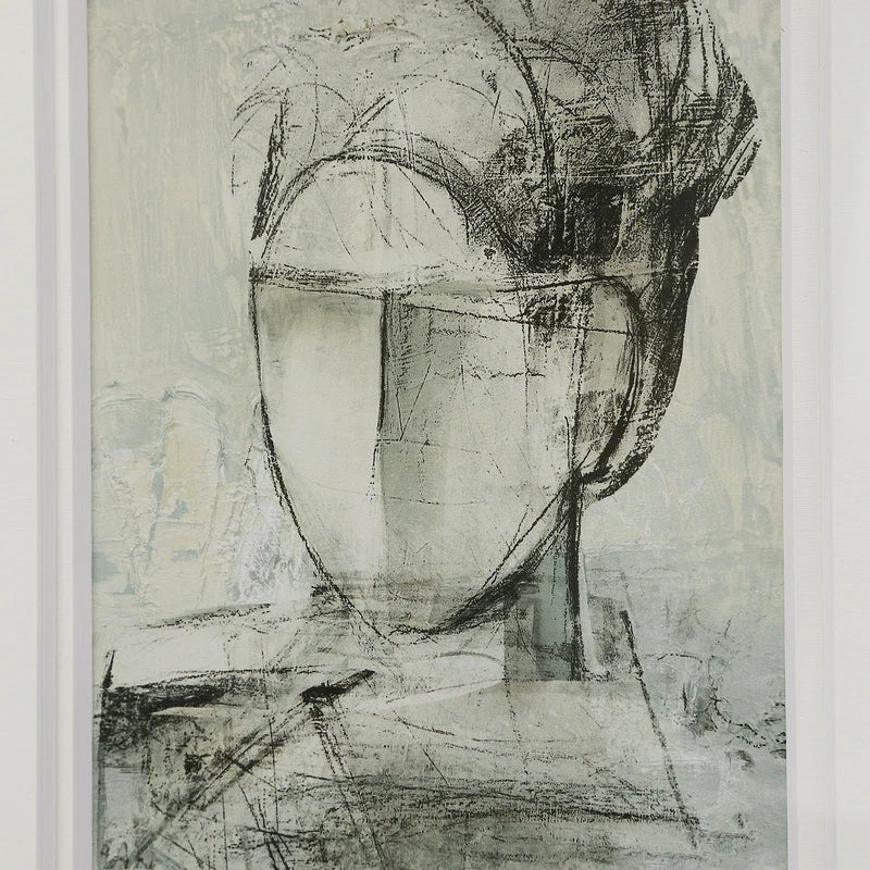 The Bellie portrait bookshelf art blends a modern abstract aesthetic with classic elegance. Soft, harmonious tones and expressive brushstrokes are showcased under glass with a double mat, creating a refined accent that enhances shelves, consoles, or built-ins with subtle sophistication and artistic charm.