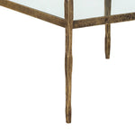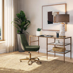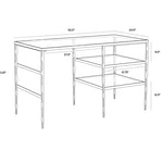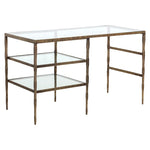 This incredible piece from our Muze collection will bring excitement to any workspace. Inspired by global travels, this desk features a unique hand-hammered steel frame with an antique brass finish. A clear glass top and two shelves provide ample storage. Made in India: With refined craftsmanship, this design was brought to life by skilled local artisans. By nature, these materials develop unique imperfections such as fissures, markings and colour variations for a truly one-of-a-kind piece.  Works great as a desk or makeup vanity.