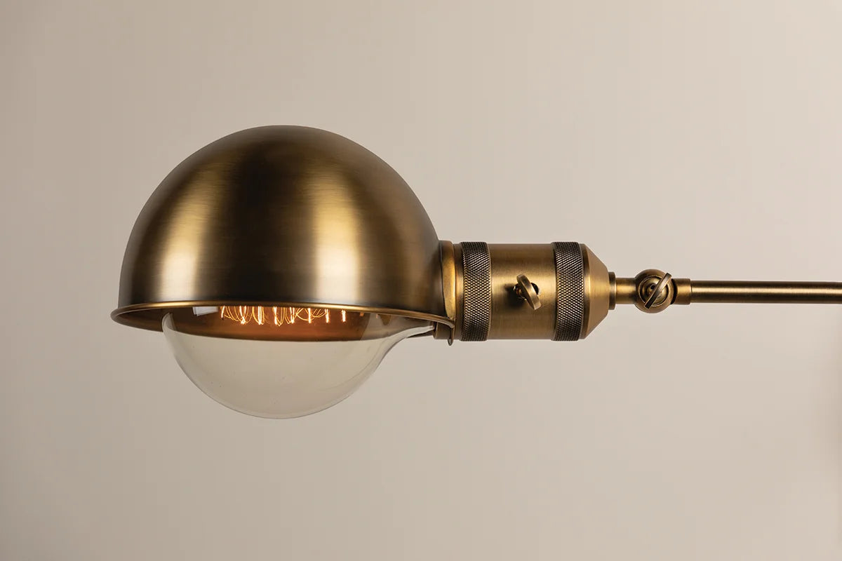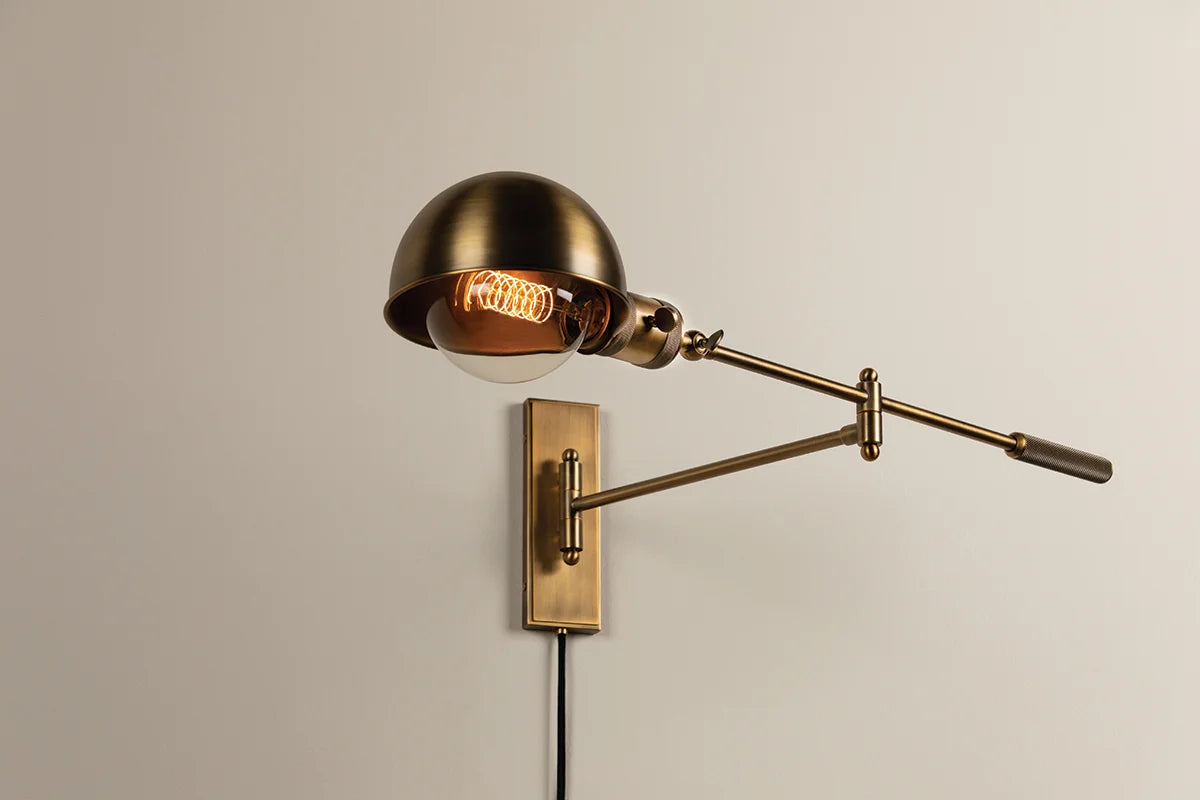 A dome-shaped Patina Brass shade at the end of a long, slender arm with exposed hardware give Cannon its retro industrial vibe. High-end details like the intricate knurling on the handle and socket add an air of sophistication. Both the arm and lamp angles are fully adjustable, making this slim-profile, plug-in sconce perfect for spaces that could benefit from customized lighting.