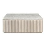 The Carmen Coffee Table, a striking blend of natural beauty and modern design, features a sleek stone top and a distinctive base with a textured, indented design. Its smooth top provides a perfect surface for entertaining, while the casters allow for easy mobility, making it a versatile piece for any room. Also available in White Oak finish.