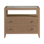 The Carmen Two-Drawer Nightstand is a stylish and functional addition to any bedroom. Its two spacious drawers, adorned with sleek metal ring pulls, offer ample storage for bedside essentials. The open shelf, accented by an inset stone top, adds a touch of luxury and provides a convenient space for displaying books or decorative objects.