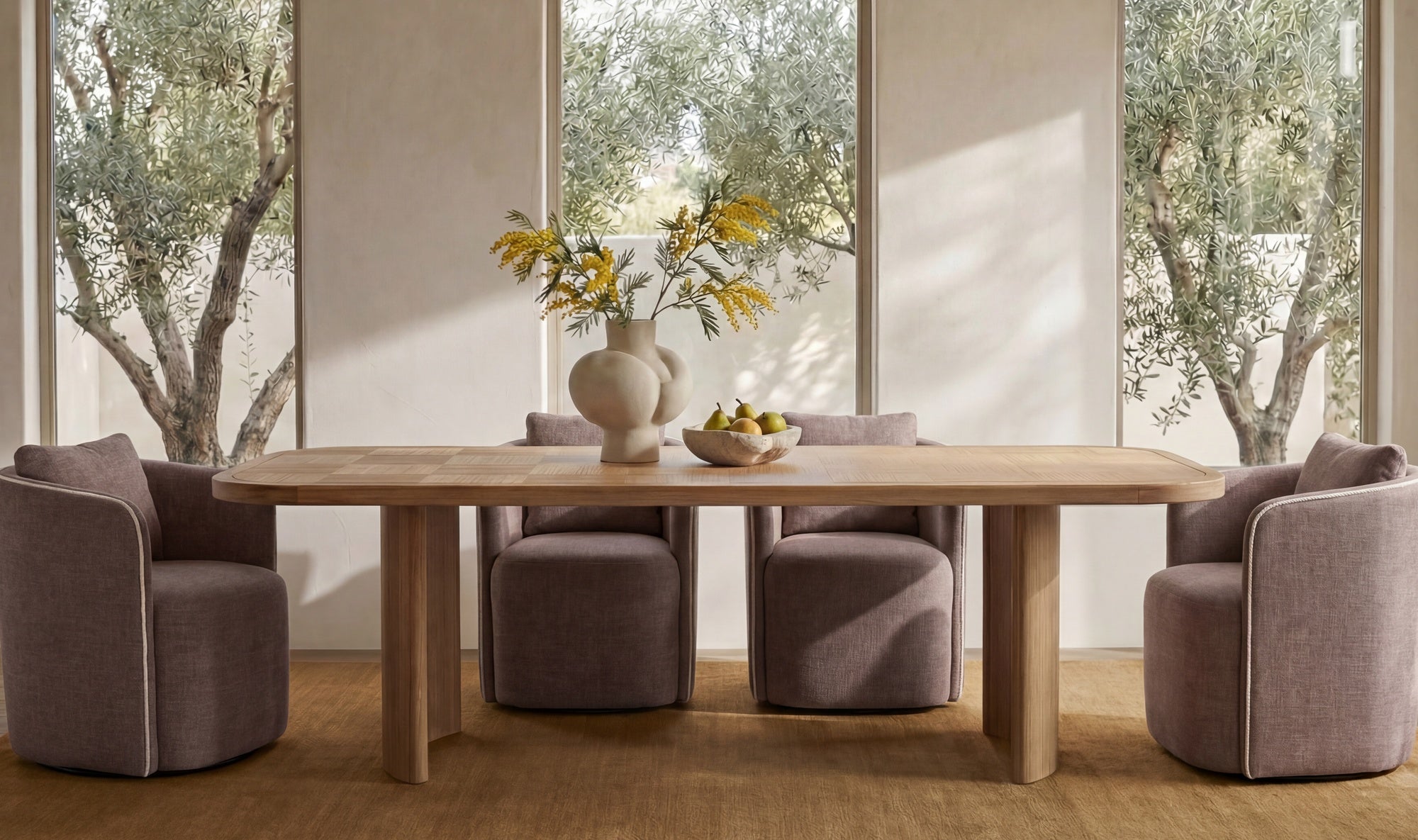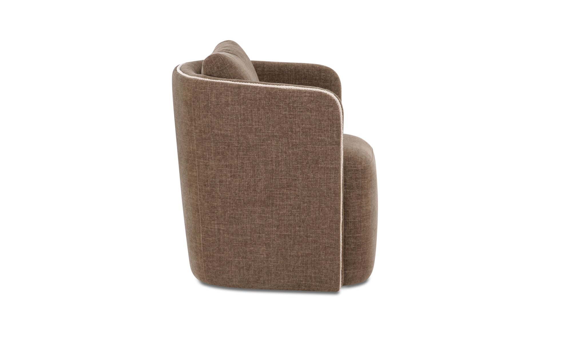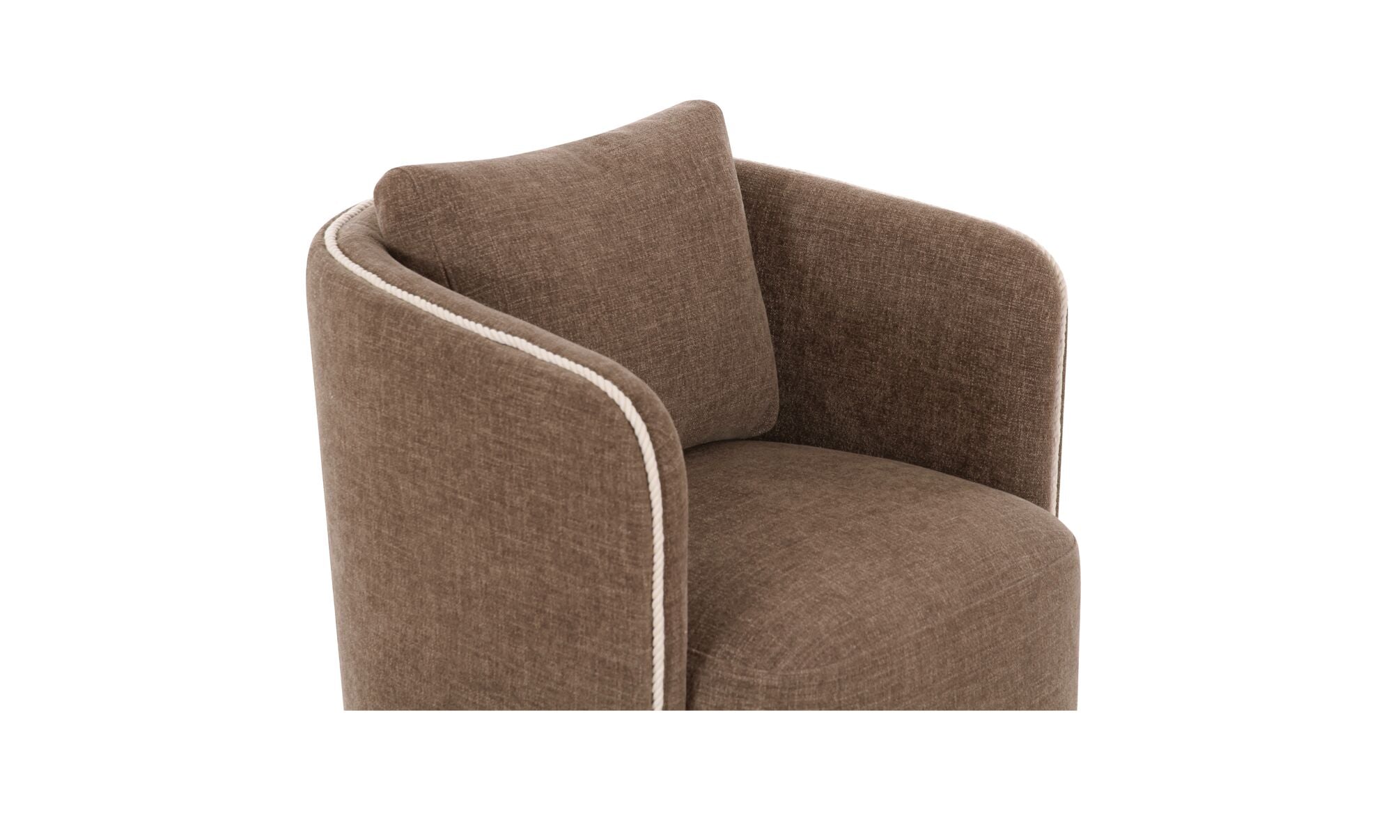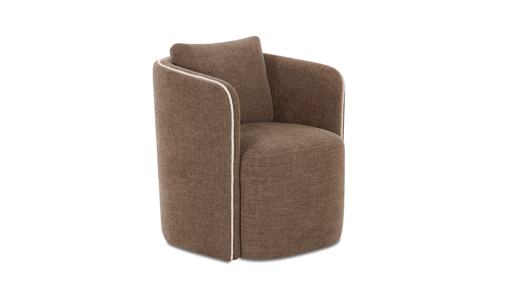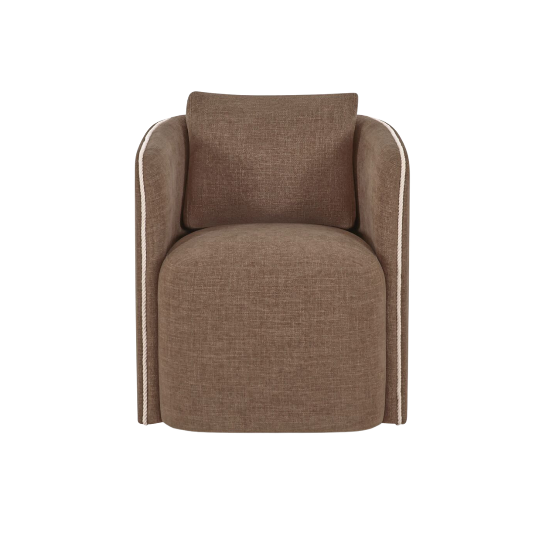 Meet Cecil: the dining chair that likes to move with the conversation. Traditional tailoring gets a modern twist with contrasting cotton cord trim and a cushioned seat made for lingering. Wrapped in micro-textured polyester in Dark Brown, it keeps the look grounded while the foam-and-fiber fill stays comfortable through long dinners. A 360-degree swivel base lets you turn in and out with ease. Pull up, spin slightly, stay awhile; let the trim do the work.