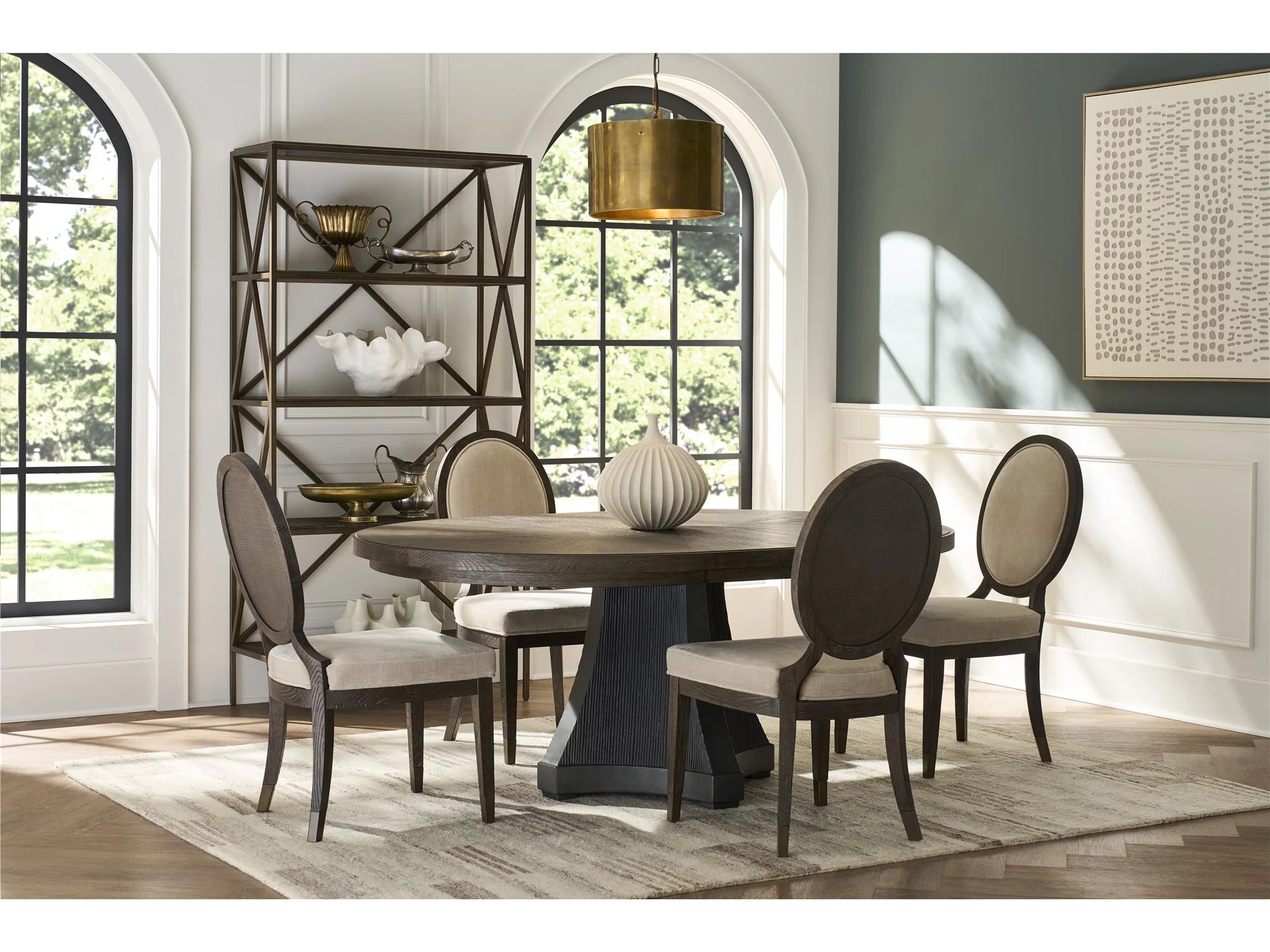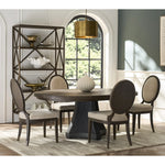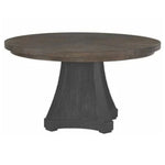 The Cinder Dining Table creates a striking centerpiece, combining a rich Cocoa wood top with an innovative glass-reinforced concrete base. This 54-inch round table features a beautiful radial pattern while the sculptural Cinder base delivers dramatic visual impact, perfect for sophisticated dining spaces.