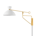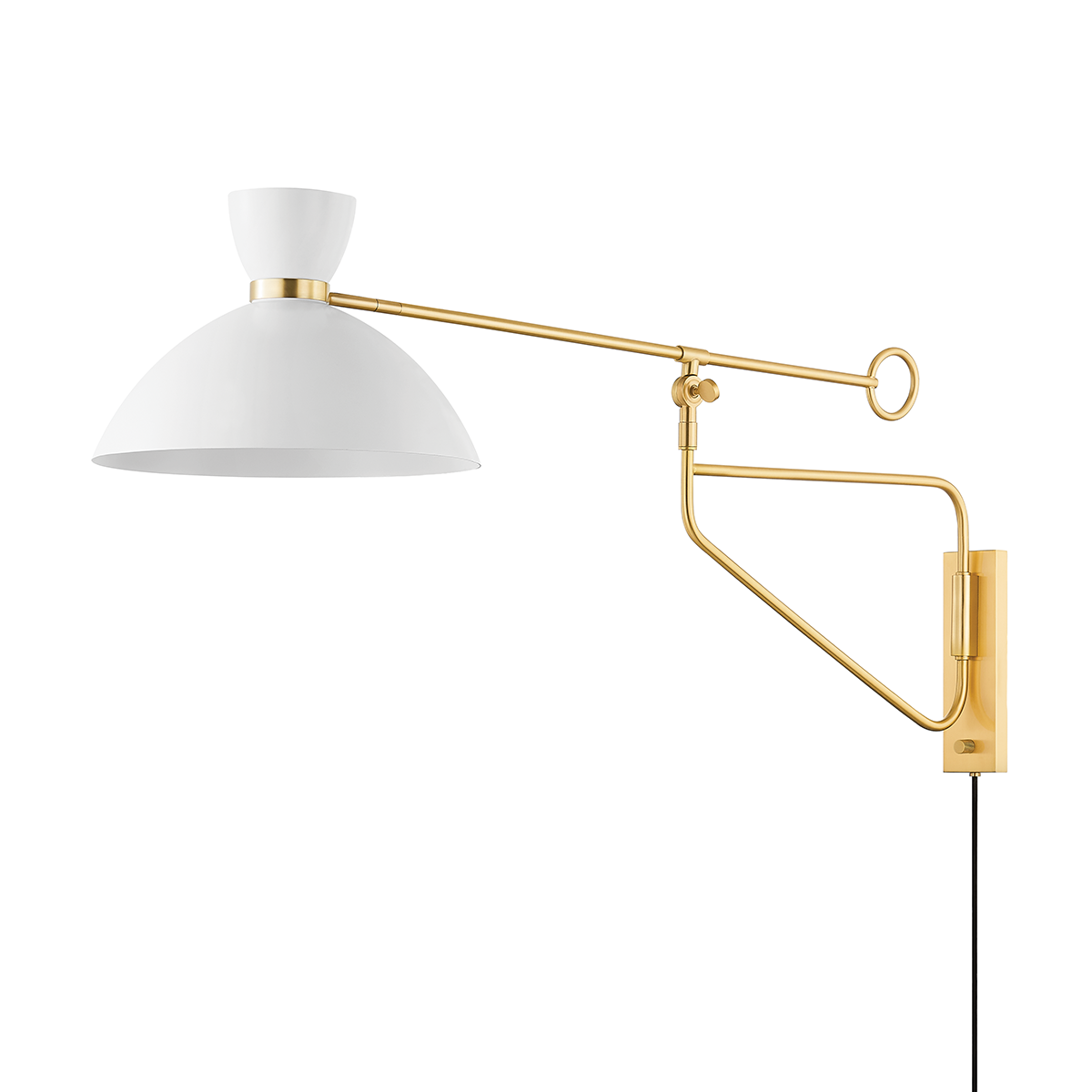 This portable wall sconce is functional—it has a full-range dimmer and pivots at two points, extending the fixture from the wall and adjusting the height of the Soft White or Black shade. It is also beautiful with metal details, slender curved arms and an Aged Brass band that transforms what would be a traditional dome shade into a pretty hourglass silhouette.