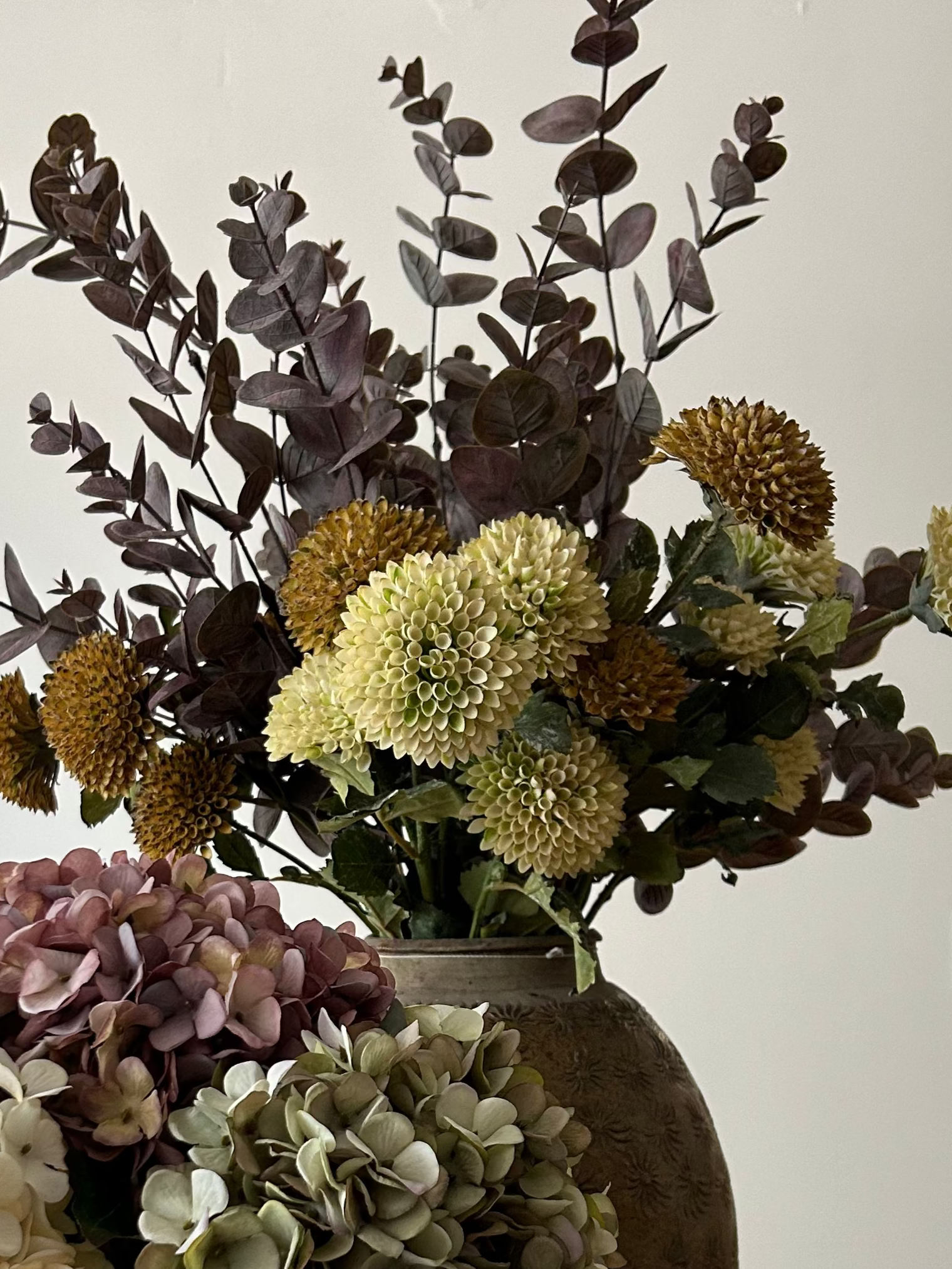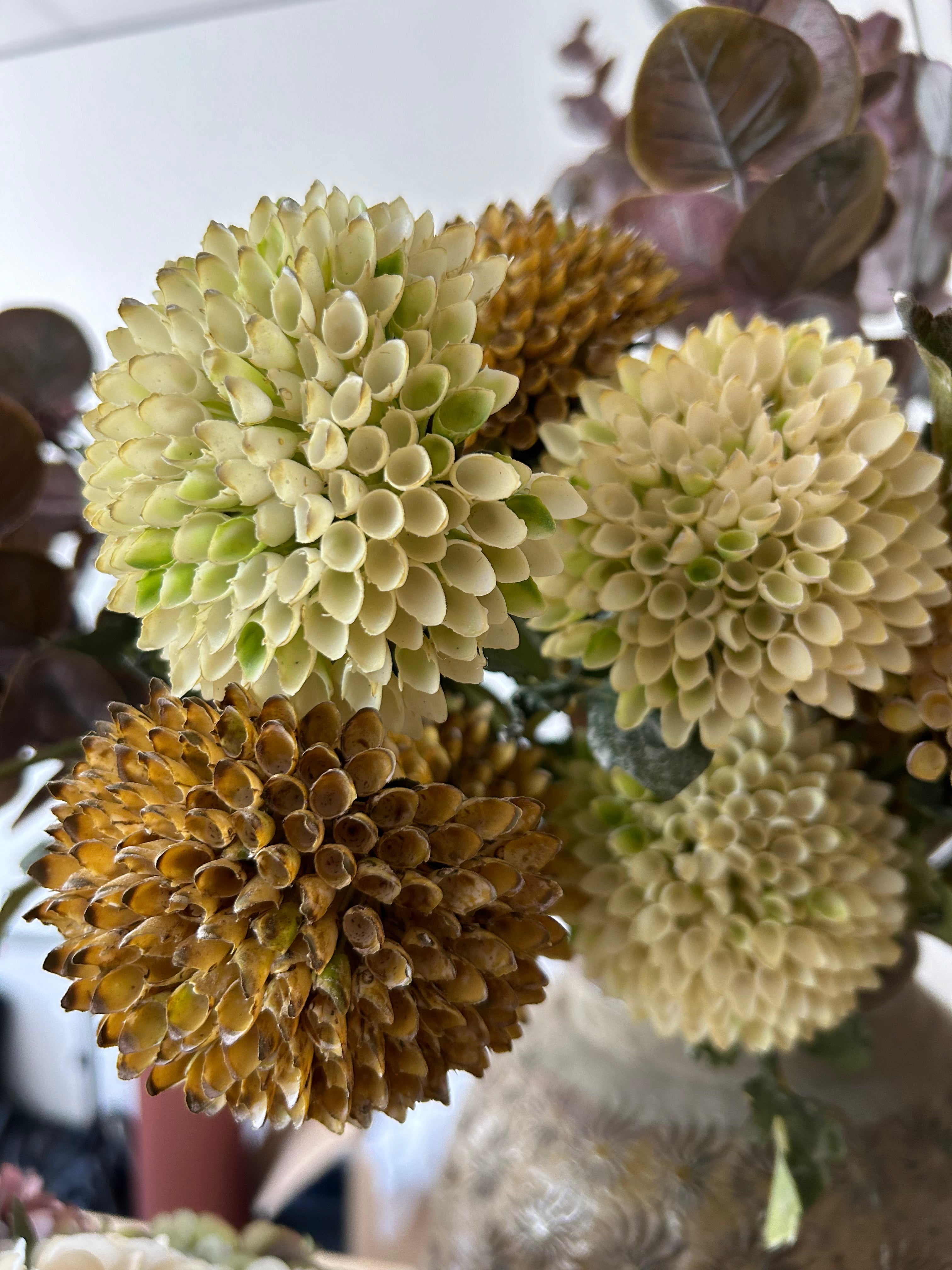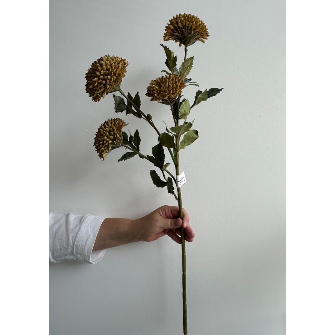 Variegated hues give our faux Scabiosa spray a rich, dusky look. Place in a vase or urn for a stunning Fall botanical accent. Shown styled in our vintage Hobi pot.
