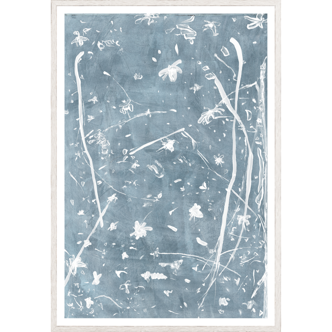 Loose gestural markings in a floral motif on a textural, chalky ground in a denim blue.