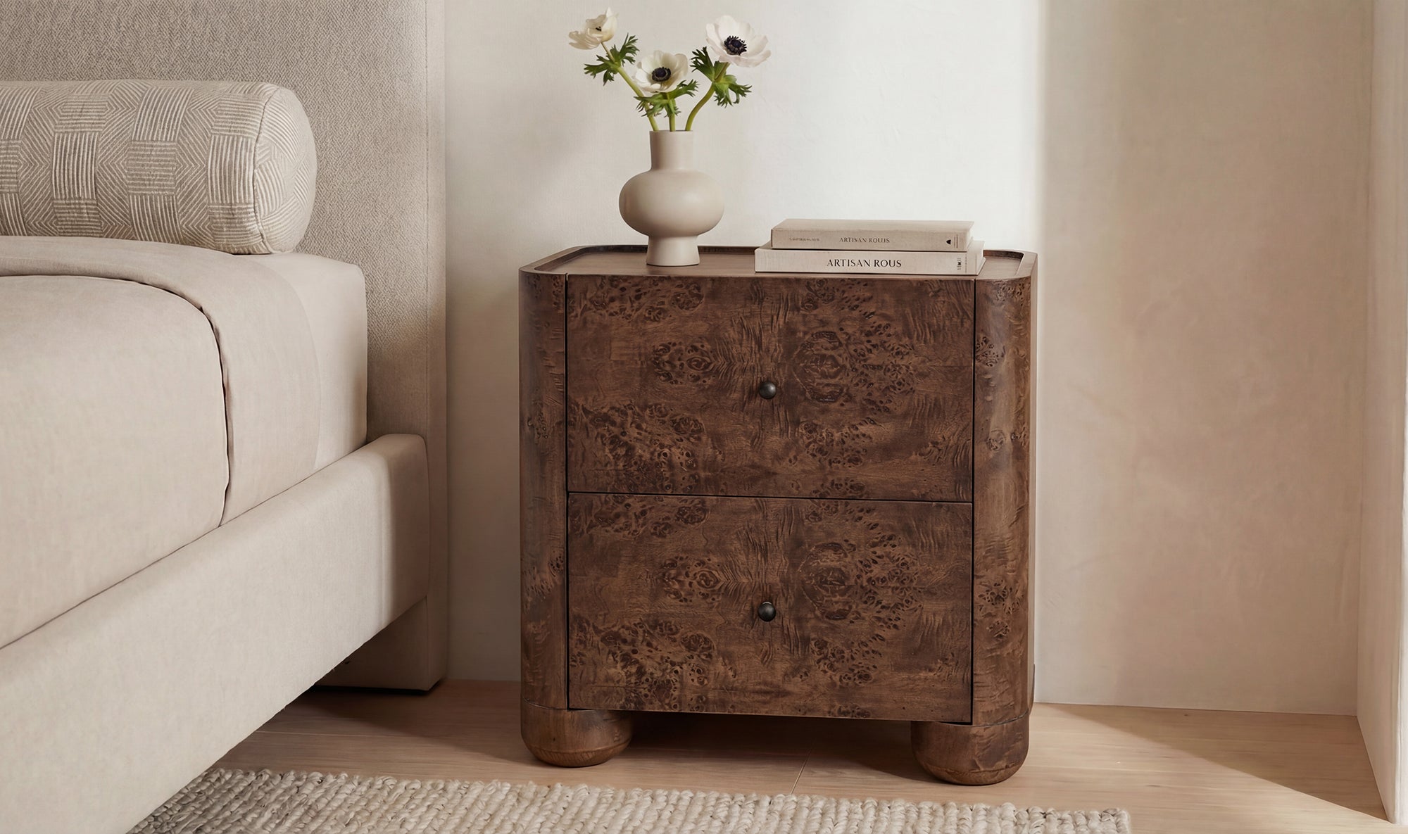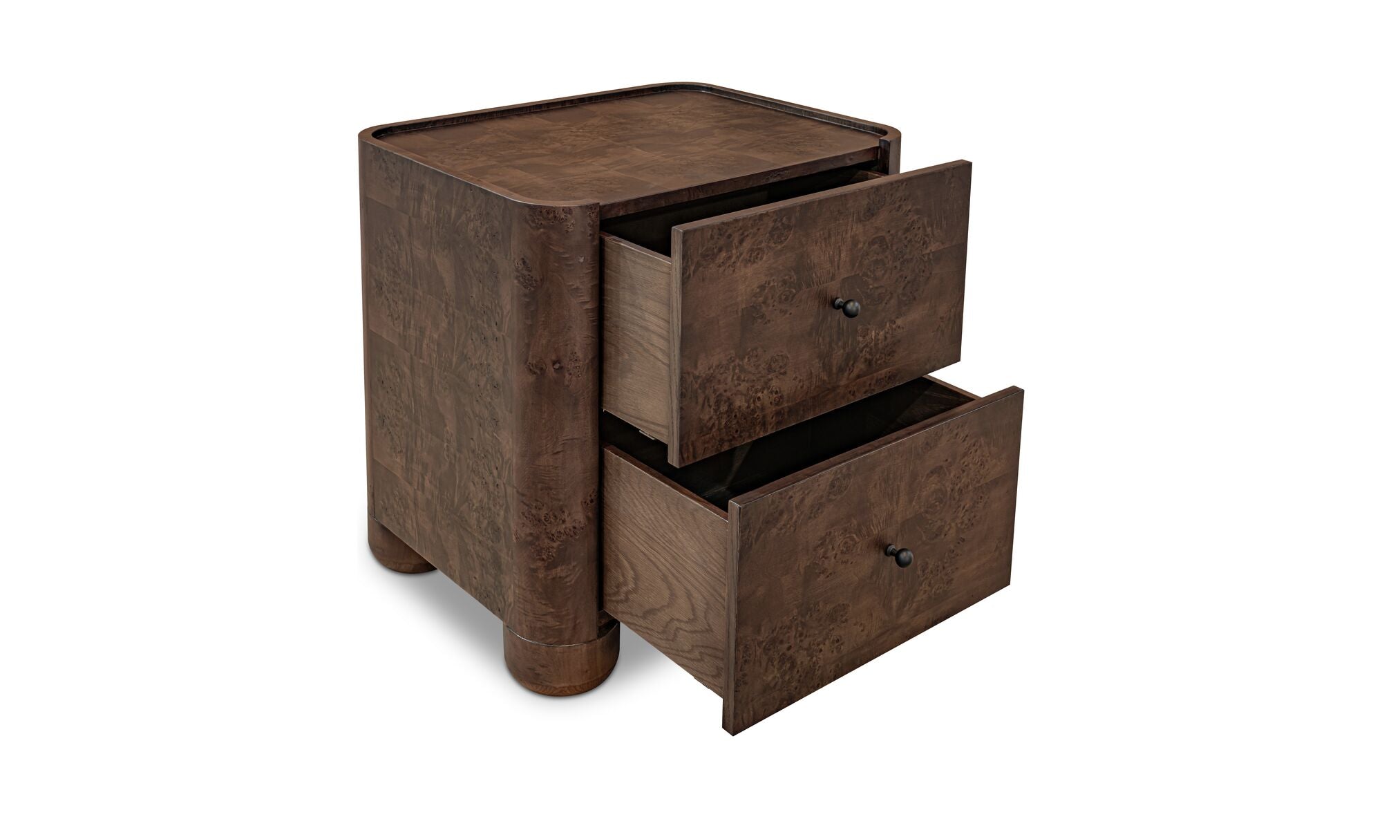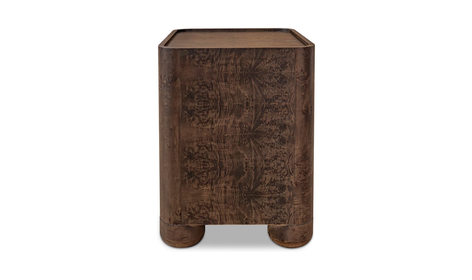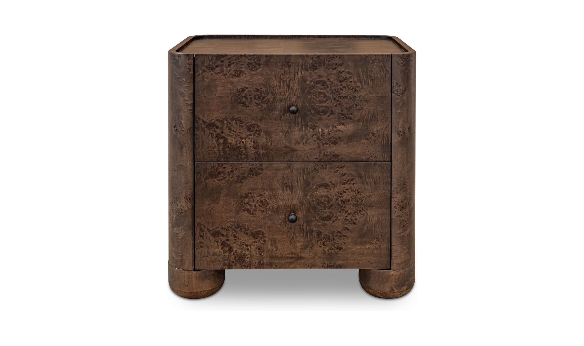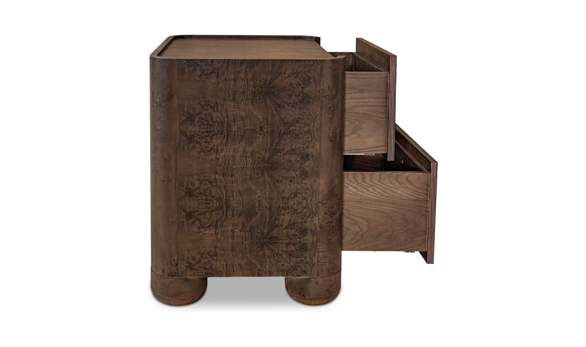 The Gibson nightstand's fluid design seamlessly integrates the leg panel into the frame, creating a captivating visual flow. Crafted from solid oak with beautifully grained burl veneer, this piece marries durability with sophistication. Playful lip detailing and a soft-close drawer add unexpected charm with its timeless appeal and meticulous craftsmanship.