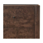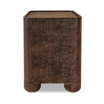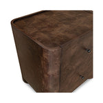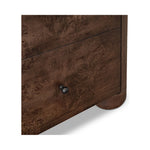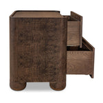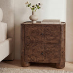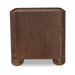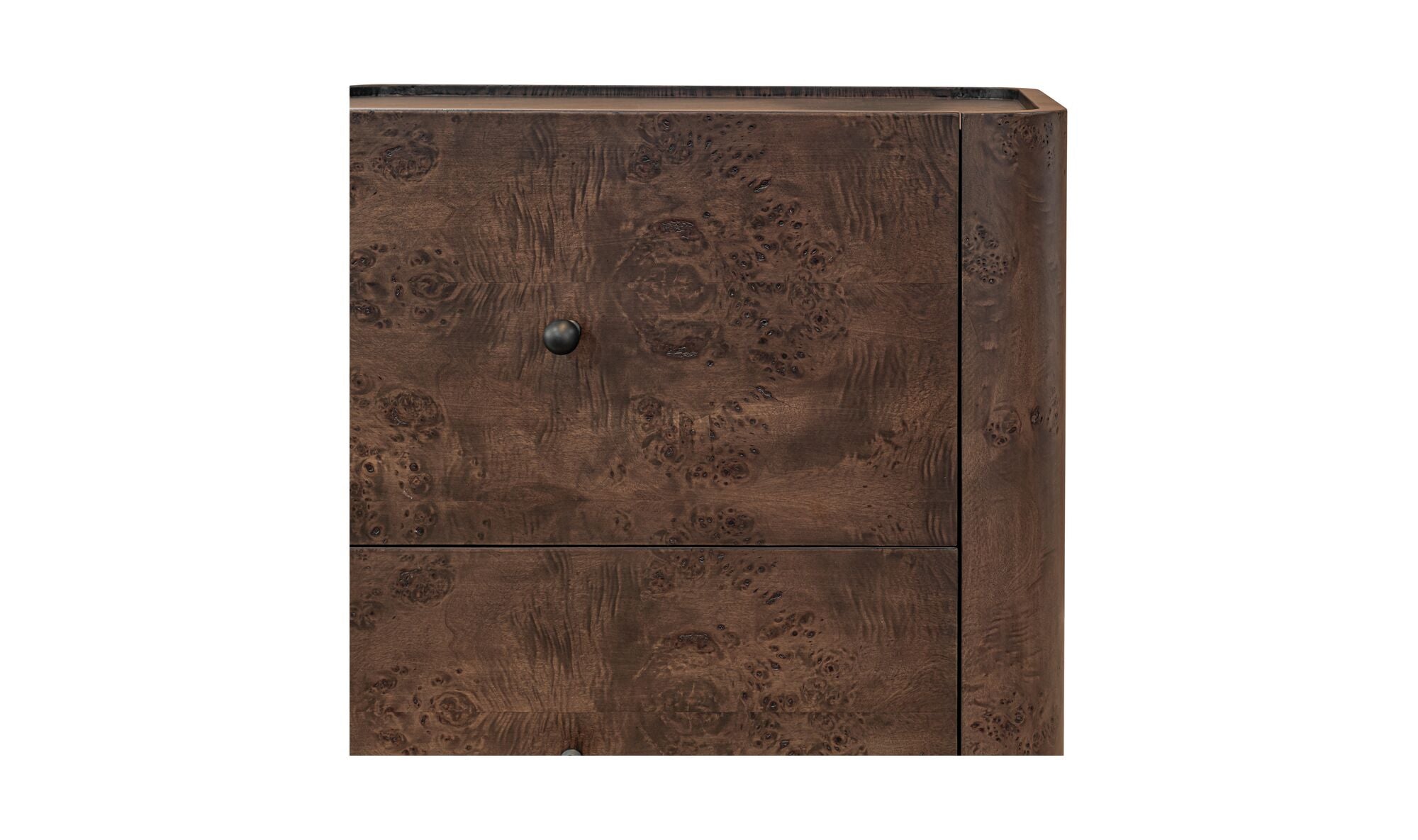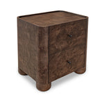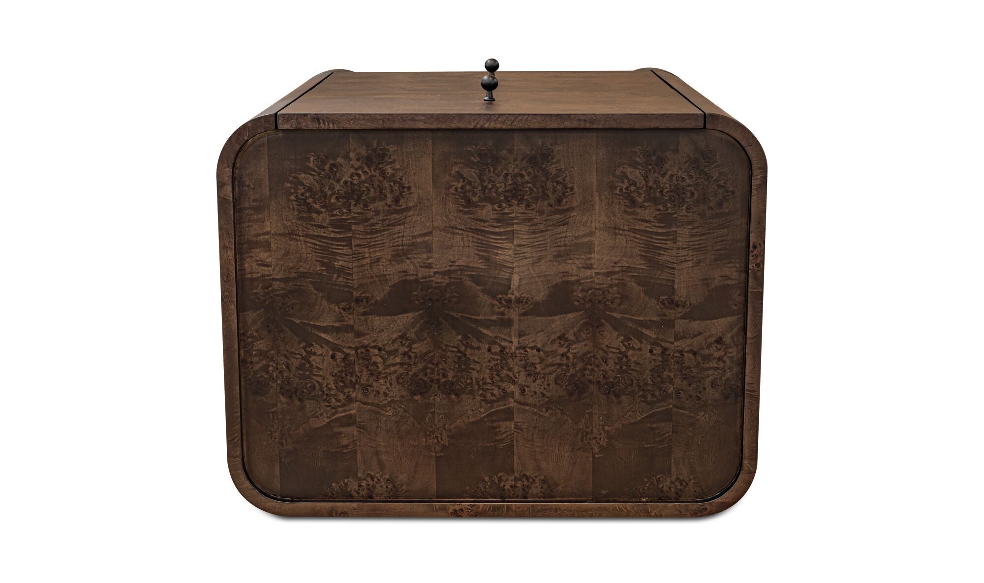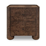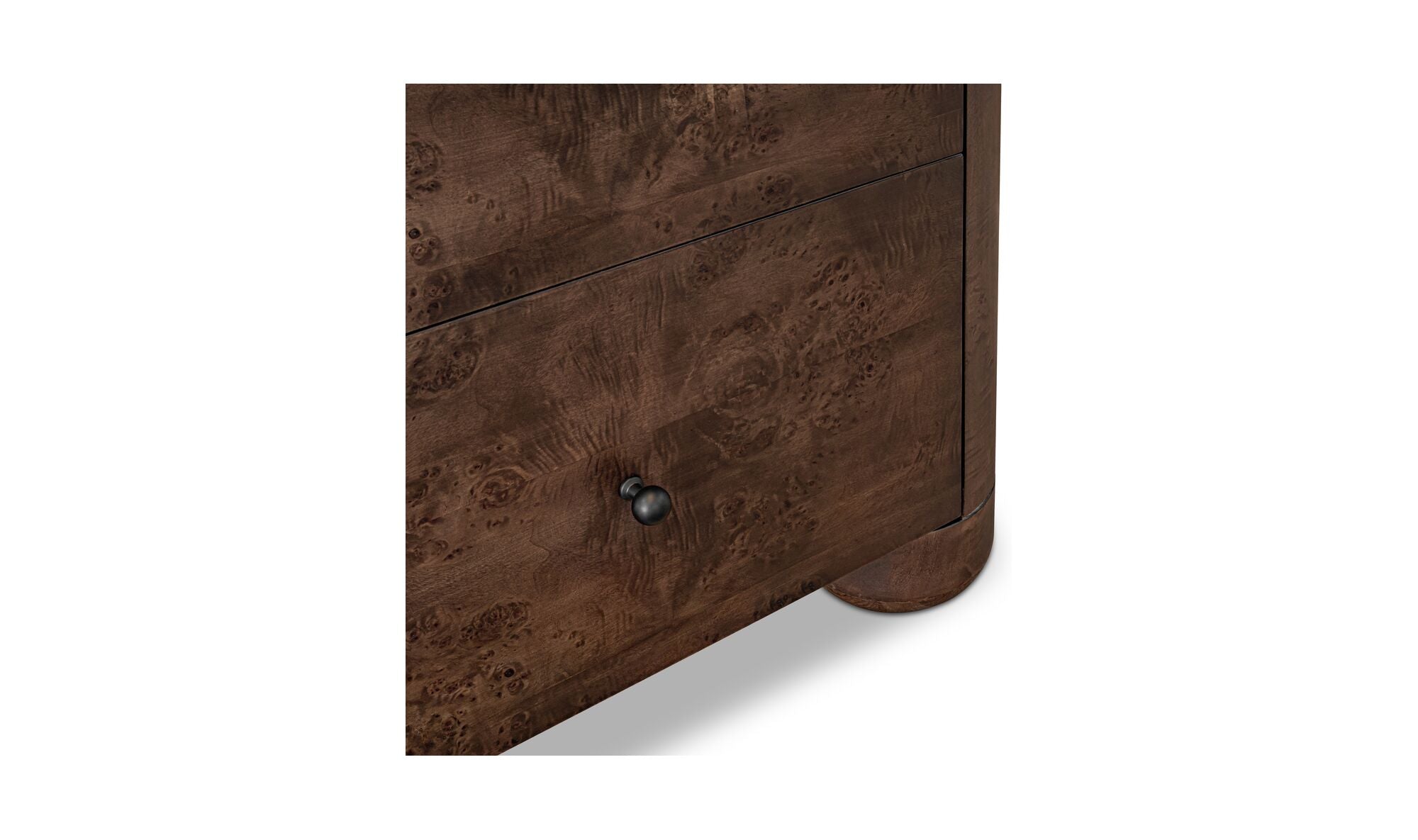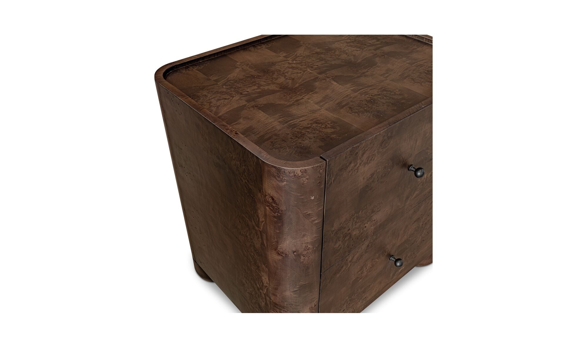The Gibson nightstand's fluid design seamlessly integrates the leg panel into the frame, creating a captivating visual flow. Crafted from solid oak with beautifully grained burl veneer, this piece marries durability with sophistication. Playful lip detailing and a soft-close drawer add unexpected charm with its timeless appeal and meticulous craftsmanship.