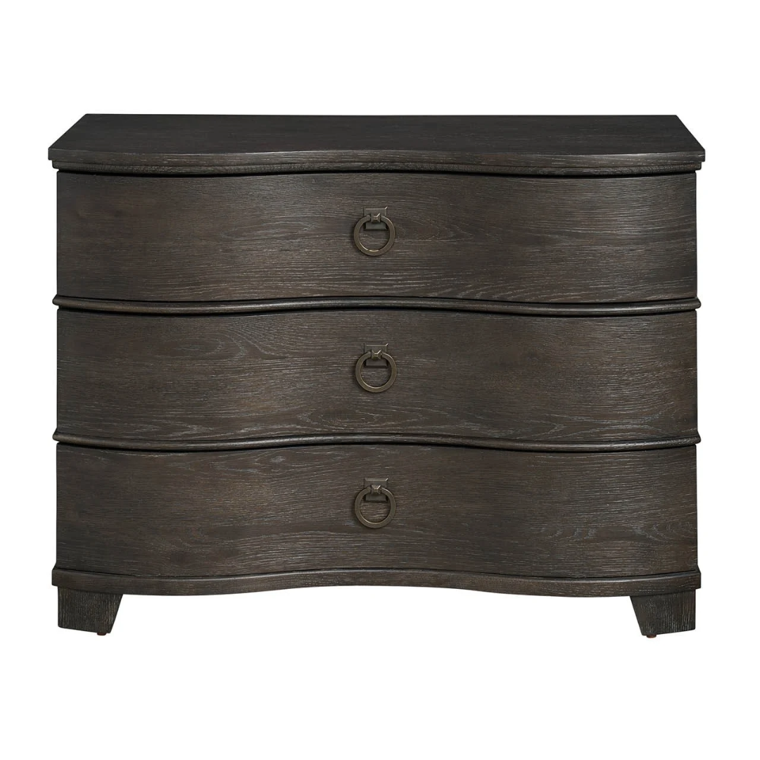 The Serpentine Chest is a captivating piece of furniture that effortlessly blends modern elegance with traditional craftsmanship. Its rich, dark brown hue and bronze ring pulls create a sophisticated aesthetic, while the curved tabletop adds a touch of unique flair.