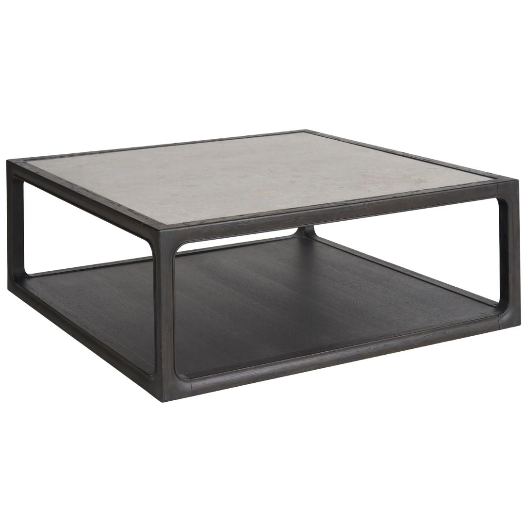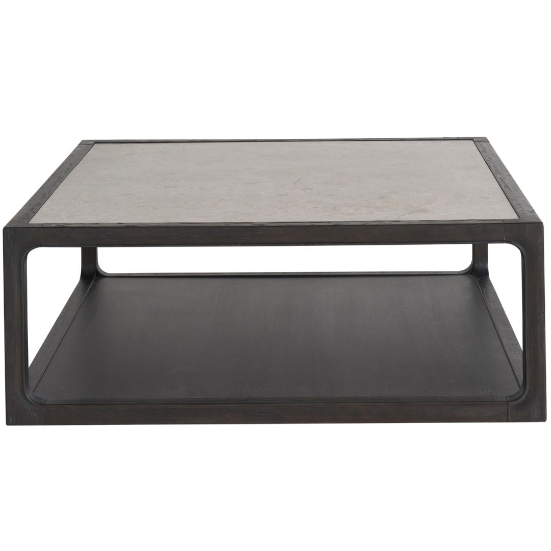 The Halen Cocktail Table, finished in the distinguished Ravenwood, showcases chic refinement with an inset stone top, offering a slender, yet impactful silhouette that anchors the living space with contemporary grace. Finish: Ravenwood