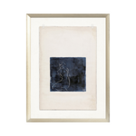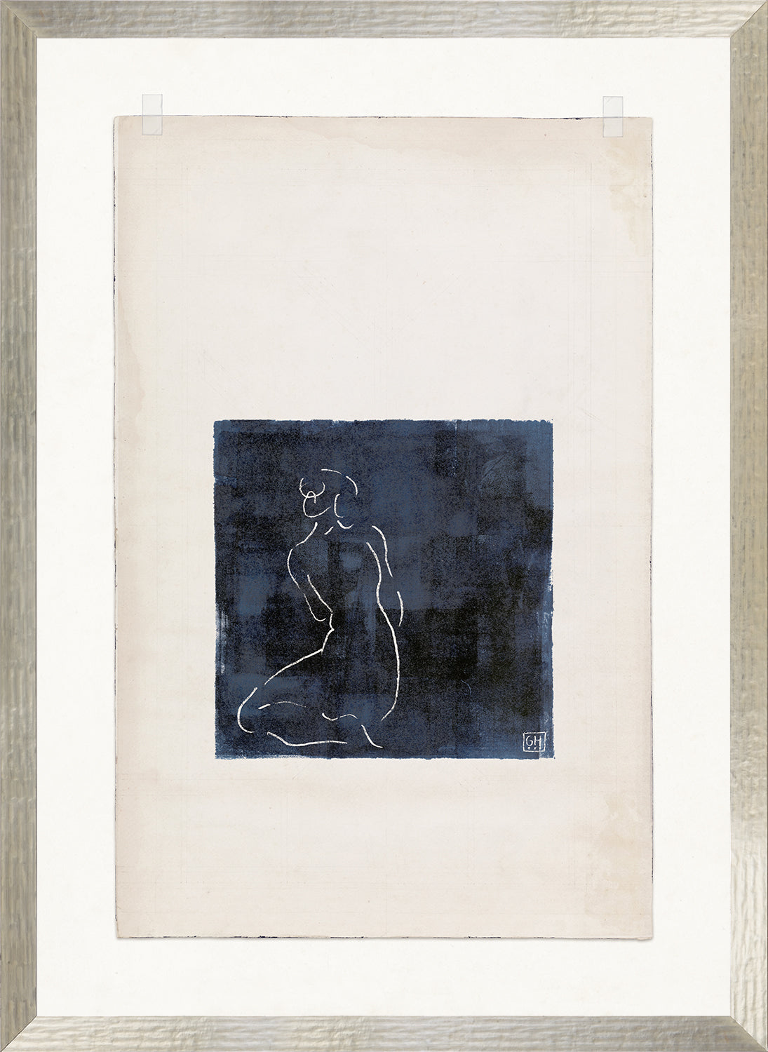 Delicate figurative drawings executed on dark indigo ink rolled surface create a lovely depth in this series of images available in two sizes.
