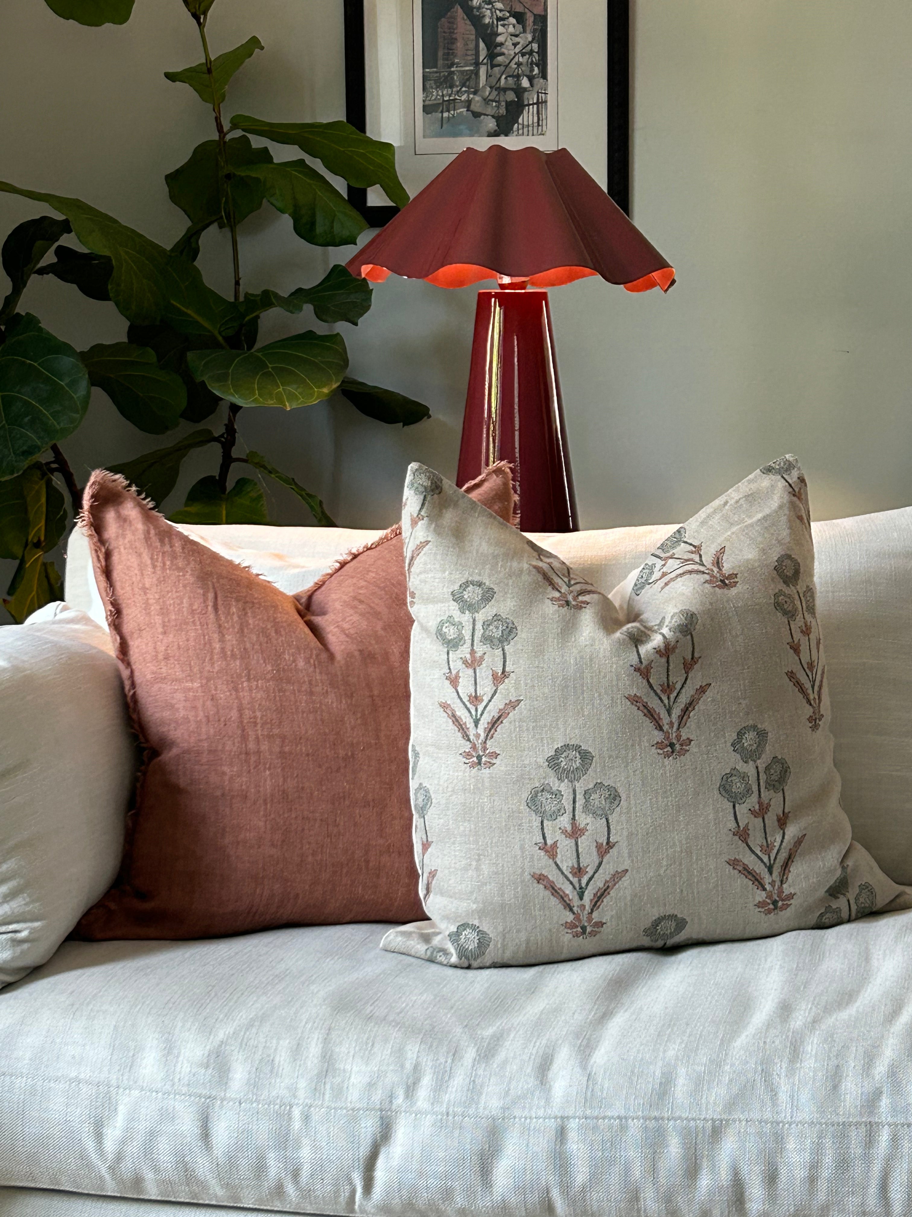 Our Lina Pillows are a soft stone washed Belgian linen. This easy to style 20" x 20" size, classic linen is updated with a frayed edge, making them beautiful standalone cushions or complements to layered textile arrangements.