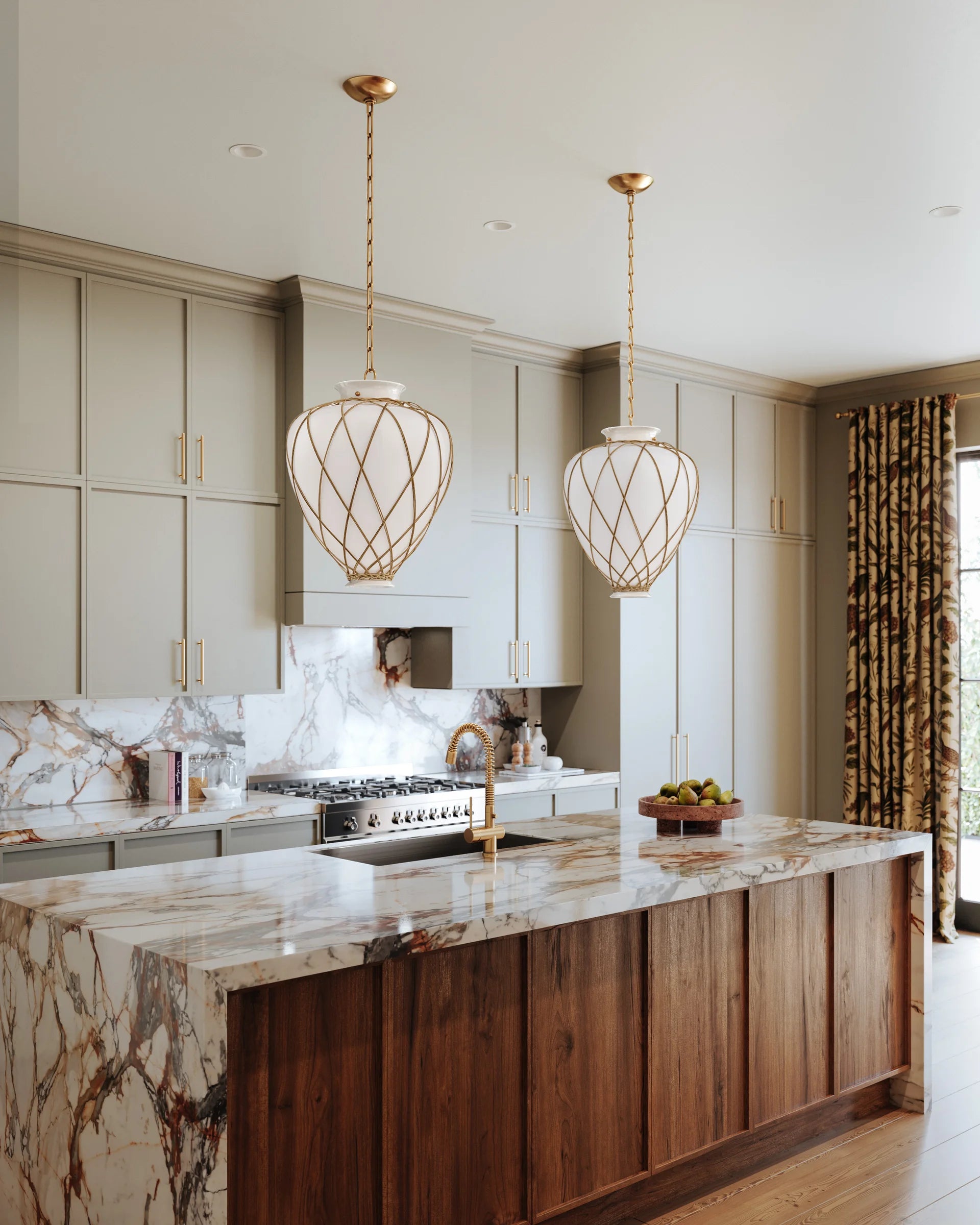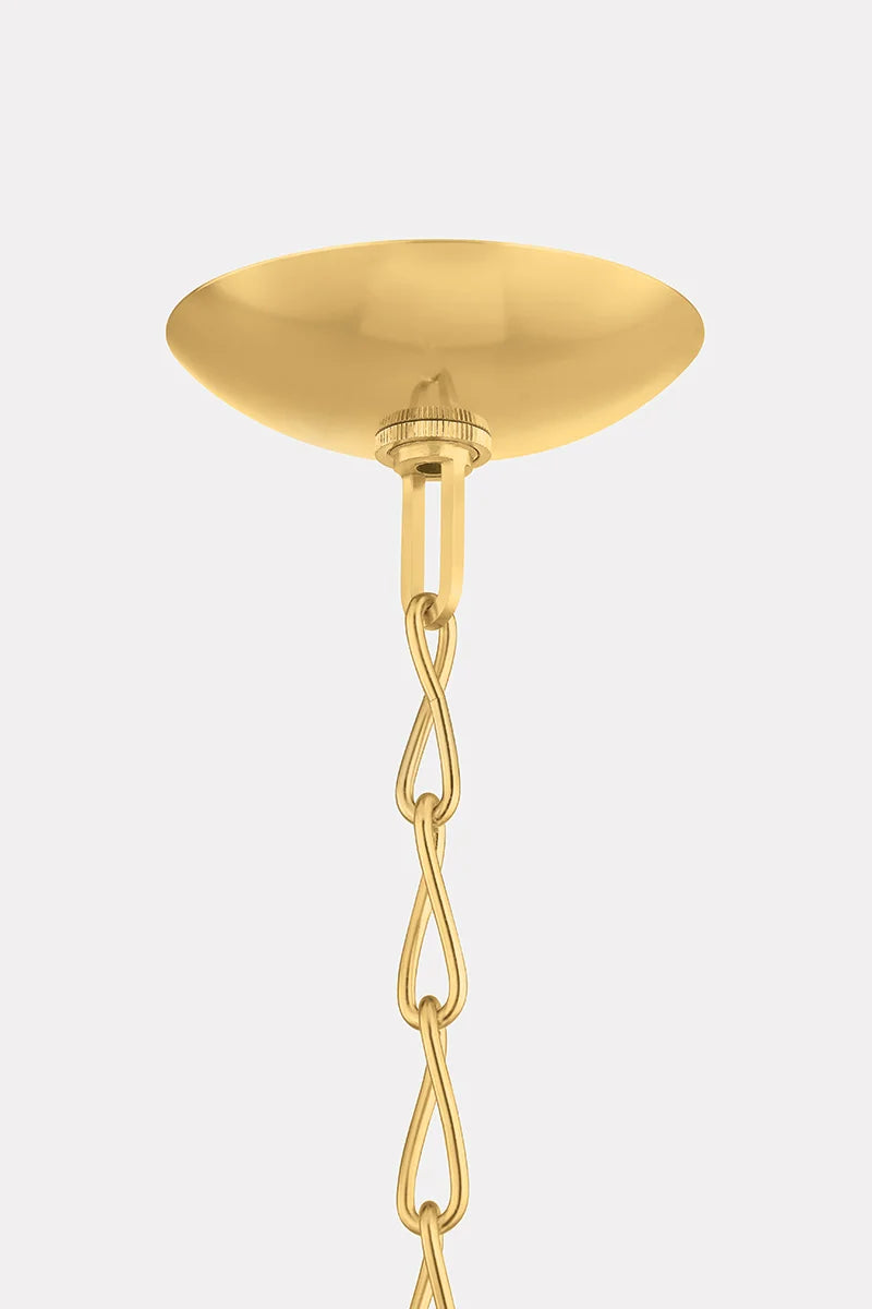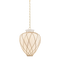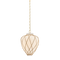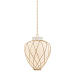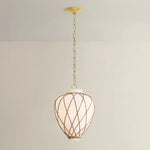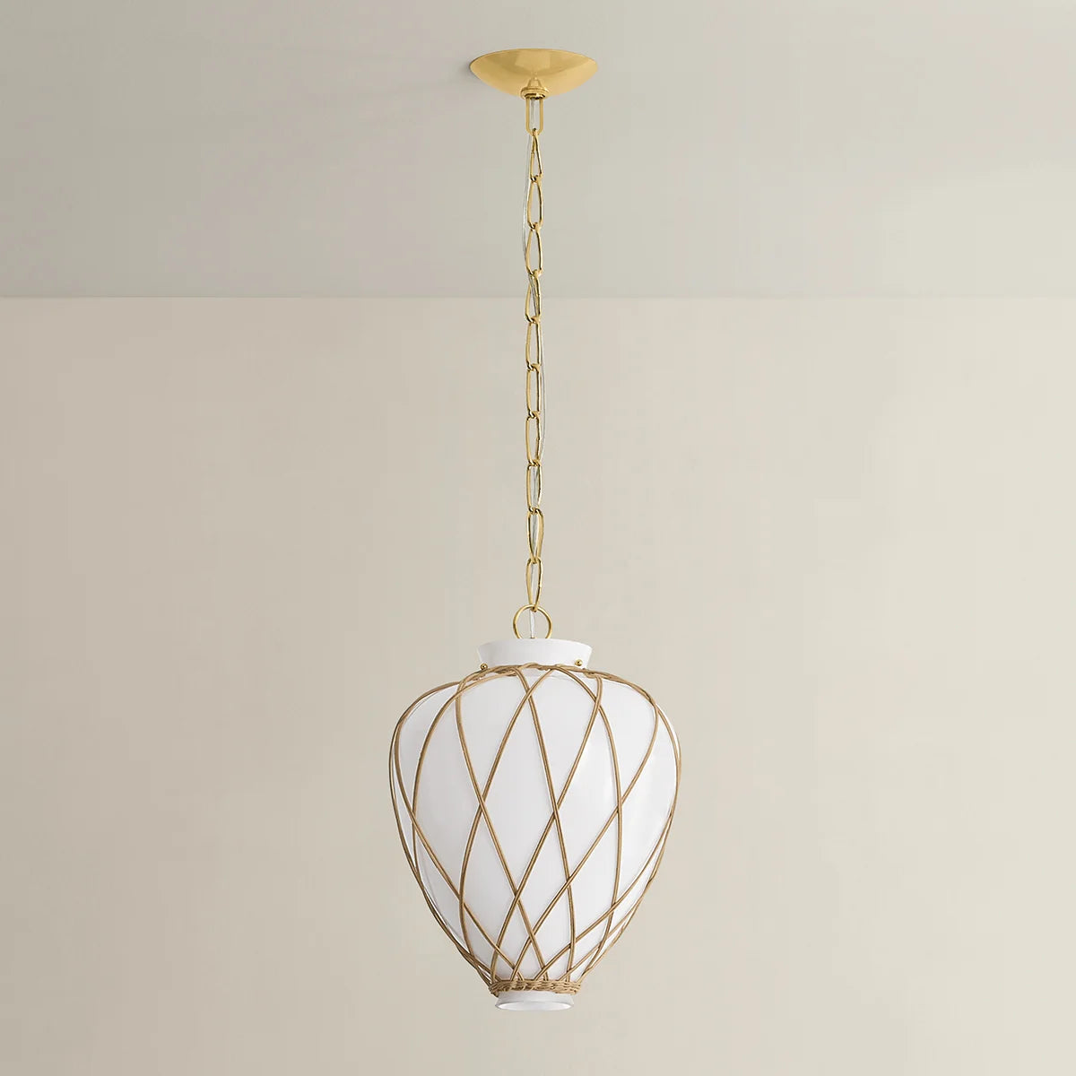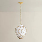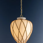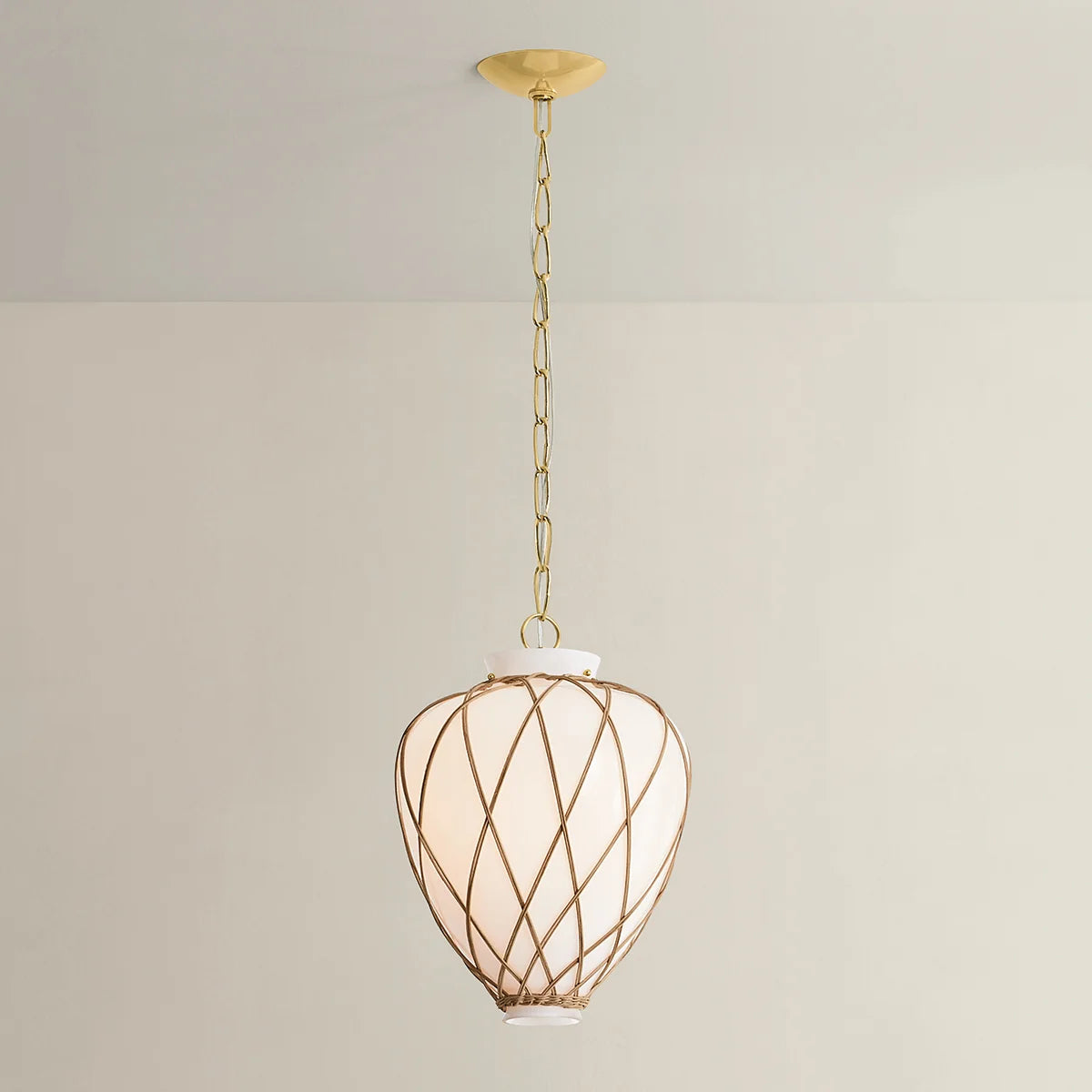 A latticework rattan cage wraps around the glass urn-shaped shade of the Apple Valley pendant, creating a textural, net-like effect. Pairing translucent opal glossy glass and rattan results in an intriguing play of light on the surfaces surrounding this lantern-like silhouette. An Aged Brass-finished chain and small rivets support the fixture, adding a polished note. Available in 13” and 17” sizes.