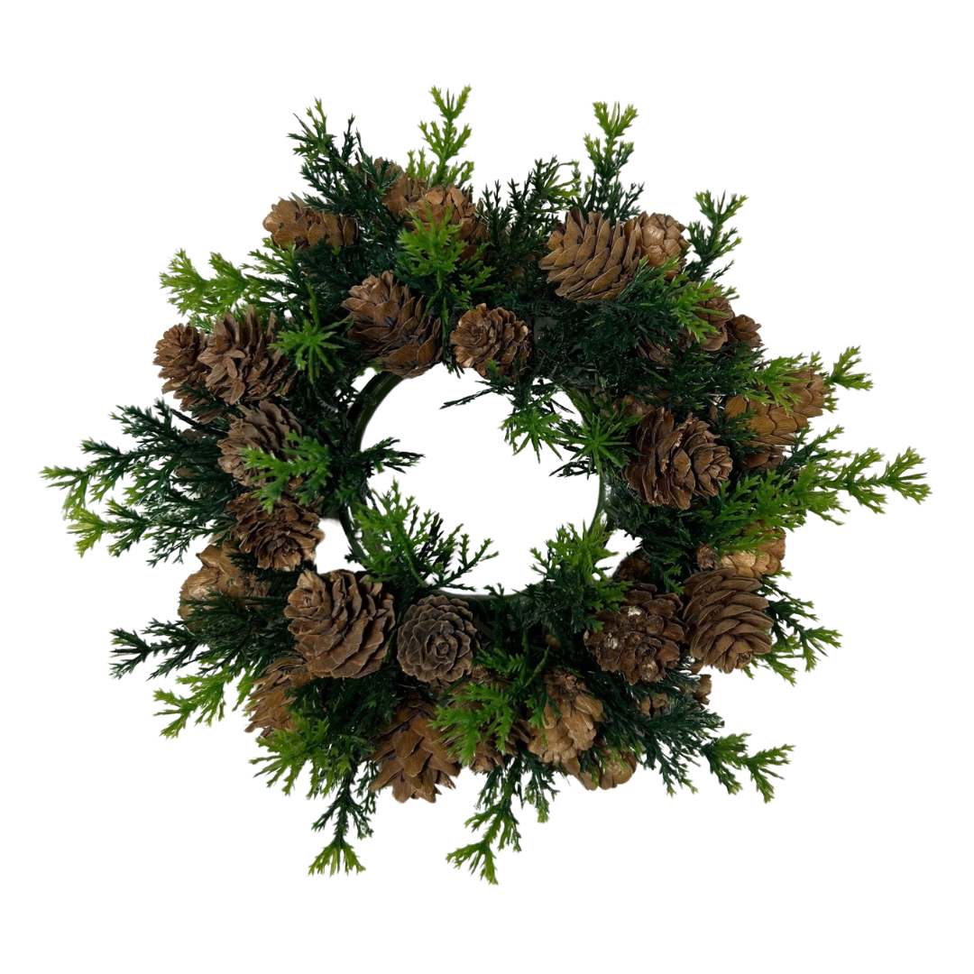 Elevate your tabletop with this faux Pine Cone Candle Ring. Crafted to complement any décor, this elegant ring wraps gracefully around our optic glass sleeves and pillar candles, adding a touch of botanical warmth and understated luxury to your home ambiance.