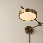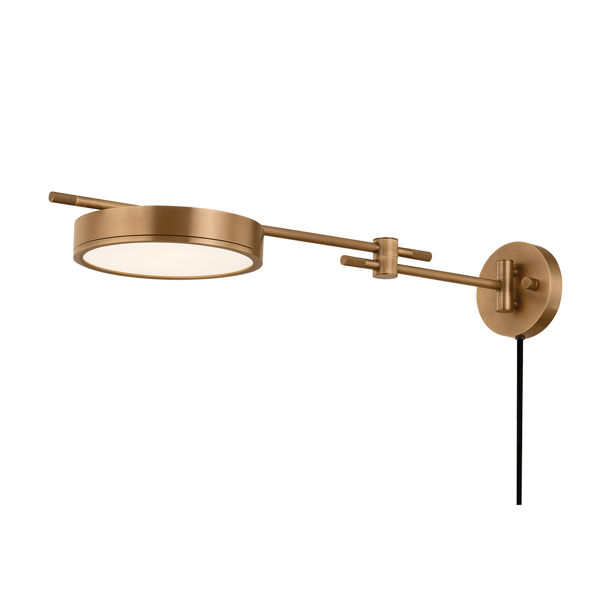 Upscale, yet highly usable, the Thatcher sconce features a striking interplay of graphic shapes. Connected by a slender arm with articulating joints, the puck-like shade mirrors the circular backplate.