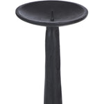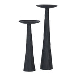 Pair of rustic candle holders.  Large pillar standing at 13" and the other 10", they complement one another and create greater dramatic impact through their differences. Composed of cast aluminum painted matte black, they are even more exquisite with glowing candles atop.
